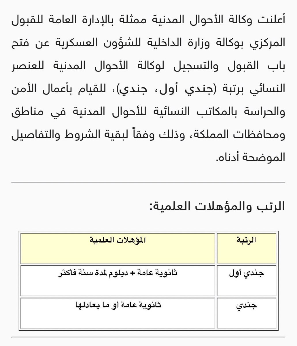 مؤسسة حقيبة أبجد على تويتر بدا التقديم على رتبة جندي أول جندي للعمل بالقسم النسائي بمكاتب الاحوال المدنية بجميع مناطق السعودية وظائف نسائيه وظائف عسكرية وظائف نسائية رابط التقديم Https T Co 4lpdnnihmk Https T Co Aketzectla