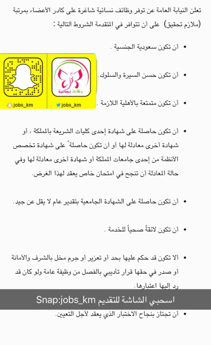 وظائف نسائية V Twitter وظائف نسائية في النيابة العامة النيابة العامة تعلن النيابة العامة عن توفر وظائف نسائية شاغرة على كادر الأعضاء بمرتبة ملازم تحقيق على أن تتوافر في المتقدمة الشروط التالية أن