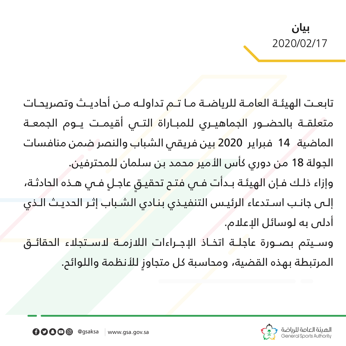 وزارة الرياضة On Twitter الهيئة العامة للرياضة ت صدر بيانا حول ماتم تداوله من أحاديث وتصريحات متعلقة بالحضور الجماهيري لمباراة الشباب والنصر وتفتح تحقيقا في هذا الشأن Https T Co Rlkcm21pmy