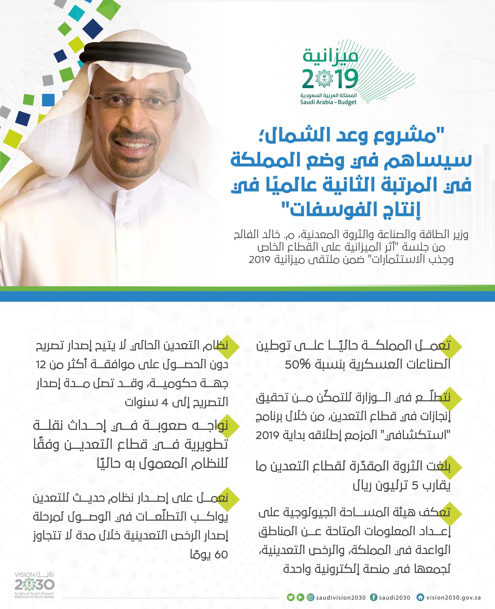 رؤية السعودية 2030 On Twitter وزير الطاقة والصناعة والثروة المعدنية خالد الفالح مشروع وعد الشمال سي ساهم في وضع المملكة في المرتبة الثانية عالمي ا في إنتاج الفوسفات رؤية السعودية 2030 ميزانية السعودية 2019 Https T Co Kc48pof6cv