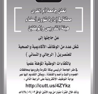 جامعة أم القرى تعلن عن وظائف أكاديمية للرجال والنساء صحيفة غراس الالكترونية