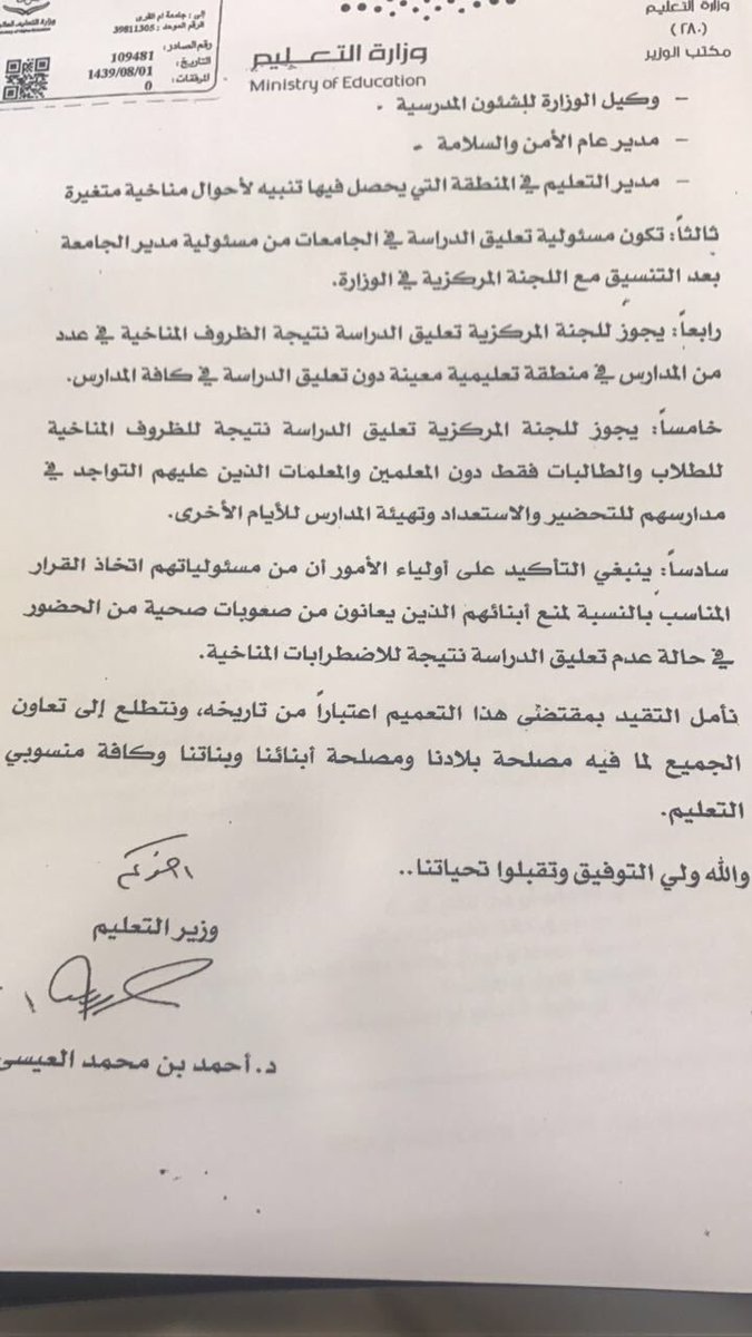 ملتقى المعلمين والمعلمات On Twitter وزارة التعليم ت صدر تعميم لضوابط جديدة في تعليق الدراسة مسؤولة عنها لجنة مركزية في الوزارة وتضع بند خامسا والذي جزء من نصه يجوز للجنة المركزية