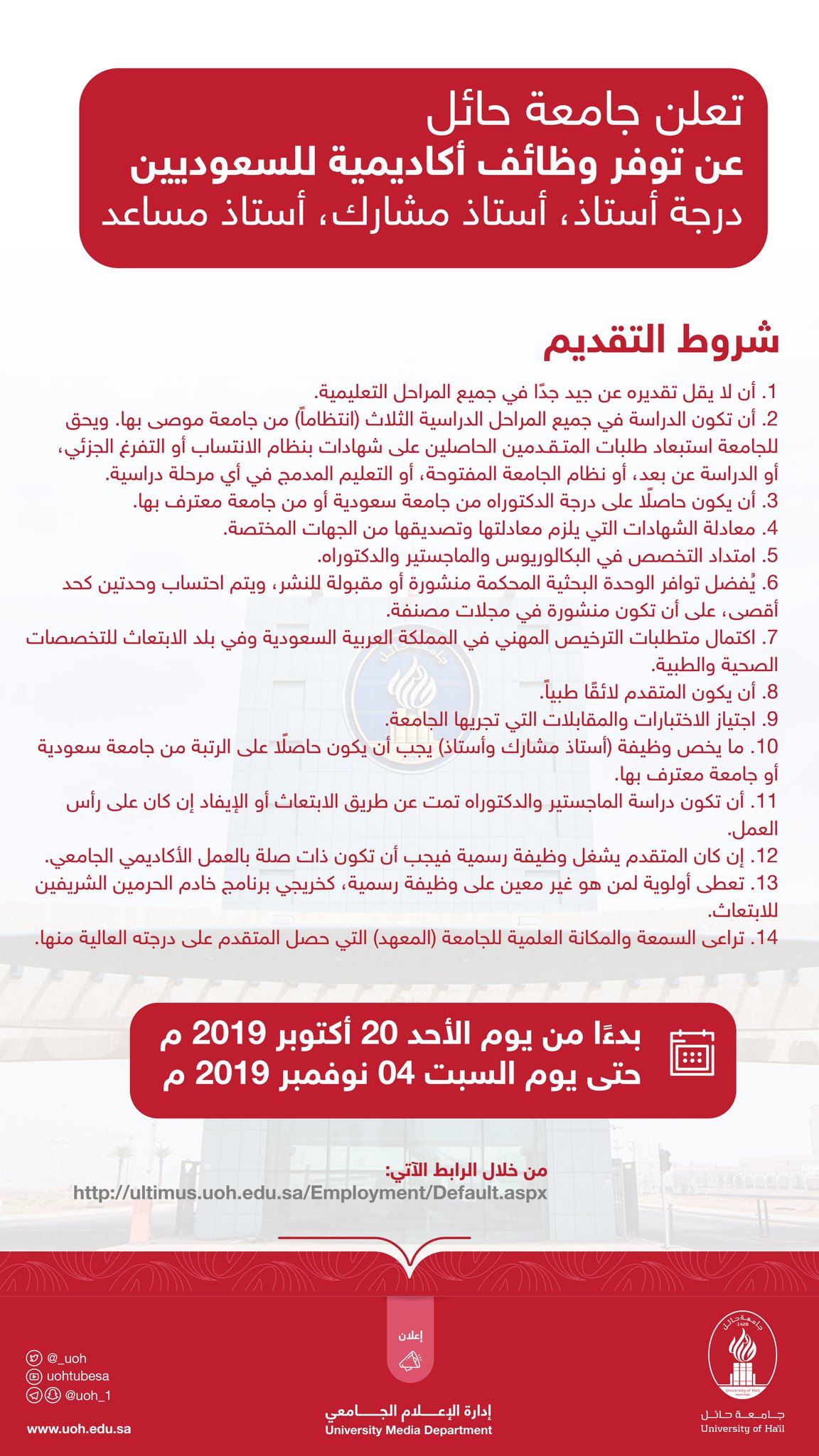 جامعة حائل On Twitter إعلان تعلن جامعة حائل عن توفر وظائف أكاديمية للسعوديين درجة أستاذ أستاذ مشارك أستاذ مساعد مرفق شروط التقديم والوظائف المعلنة حسب احتياج الكليات خلال الفترة من 20 أكتوبر