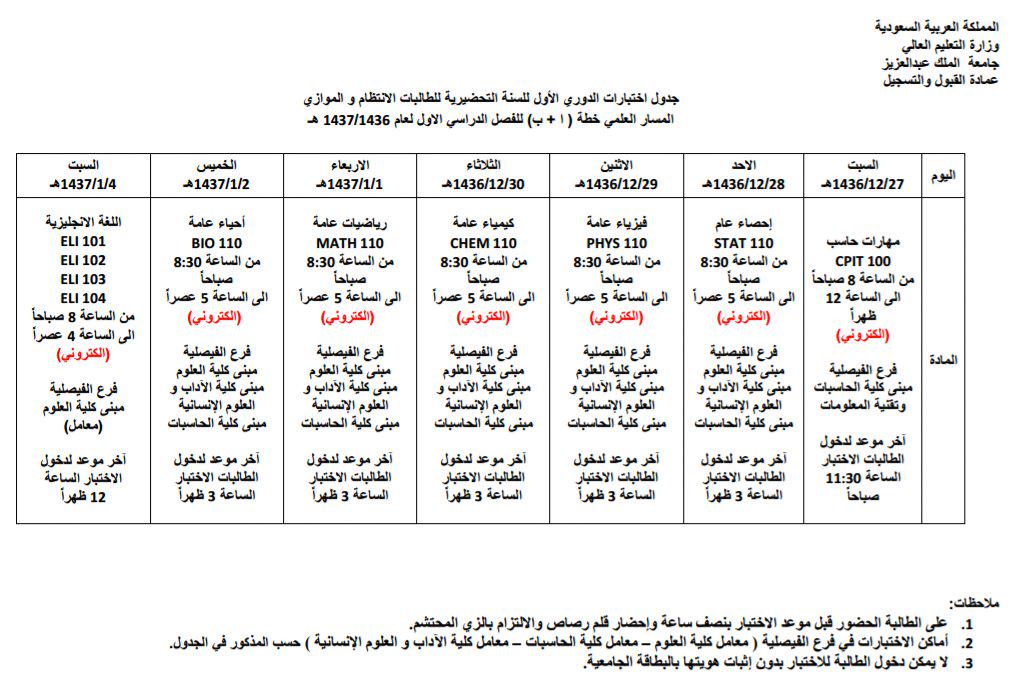 جدول اختبارات جامعة الملك عبدالعزيز 1437