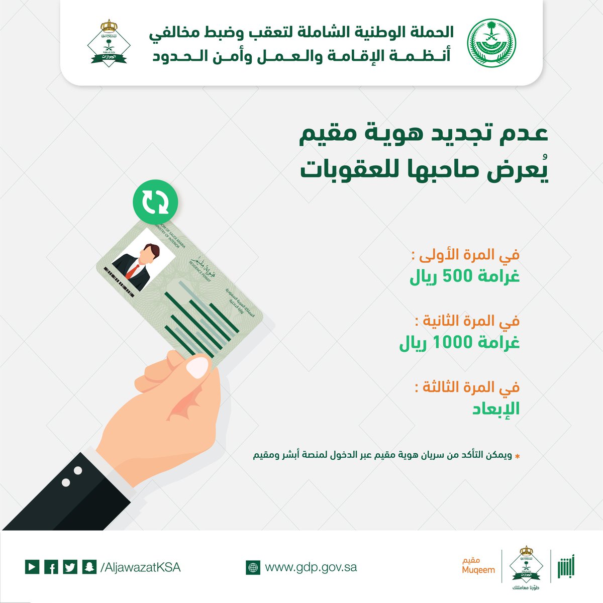 الجوازات السعودية On Twitter عزيزي المقيم تقيدك بالأنظمة والقوانين يساهم في عدم تعرضك للعقوبات المفروضة في حال عدم تجديد هوية مقيم وطن بلا مخالف Https T Co Rxk0laj3kb