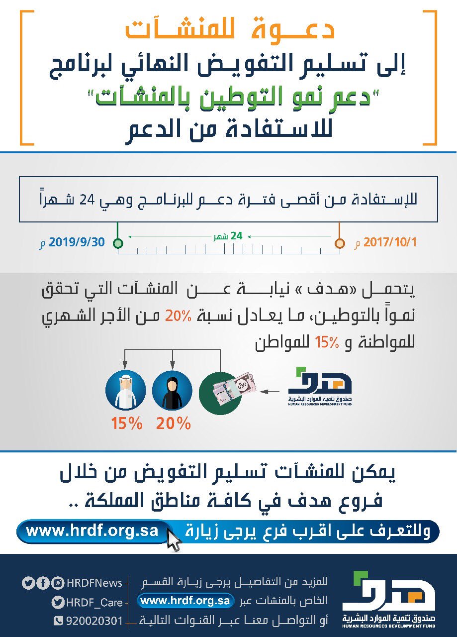 هدف On Twitter صندوق تنمية الموارد البشرية هدف يدعو أصحاب المنشآت إلى تسليم التفويض النهائي لبرنامج دعم نمو التوطين بالمنشآت إلى فروع هدف المنتشرة في كافة مناطق المملكة للاستفادة من دعم البرنامج Https T Co Gwxnbdvuga