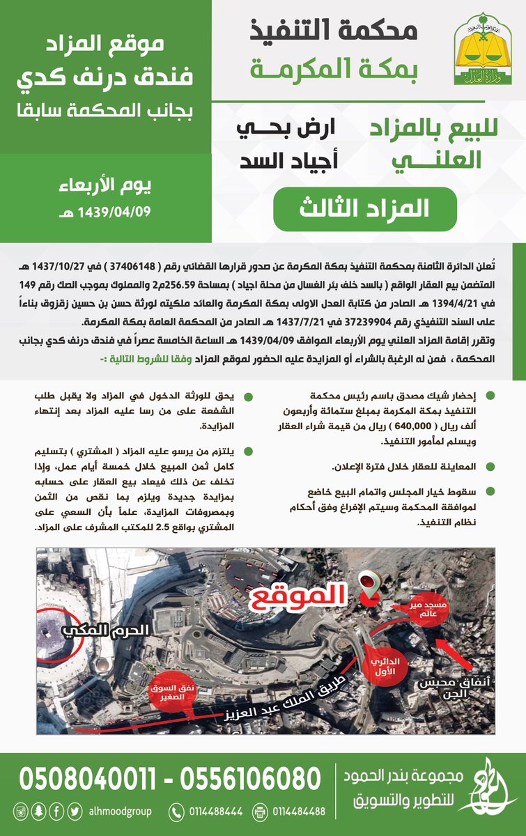 اعلان محكمة التنفيذ بمكة المكرمة للمزاد الثالث لبيع عقارات
