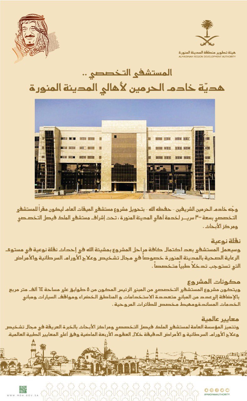 قـريـبـا فـي الـمـديـنـة En Twitter تحويل مستشفى الميقات الجديد في حمراء الأسد بـ المدينة المنورة إلى مستشفي تخصصي يتبع لمستشفى الملك فيصل التخصصي