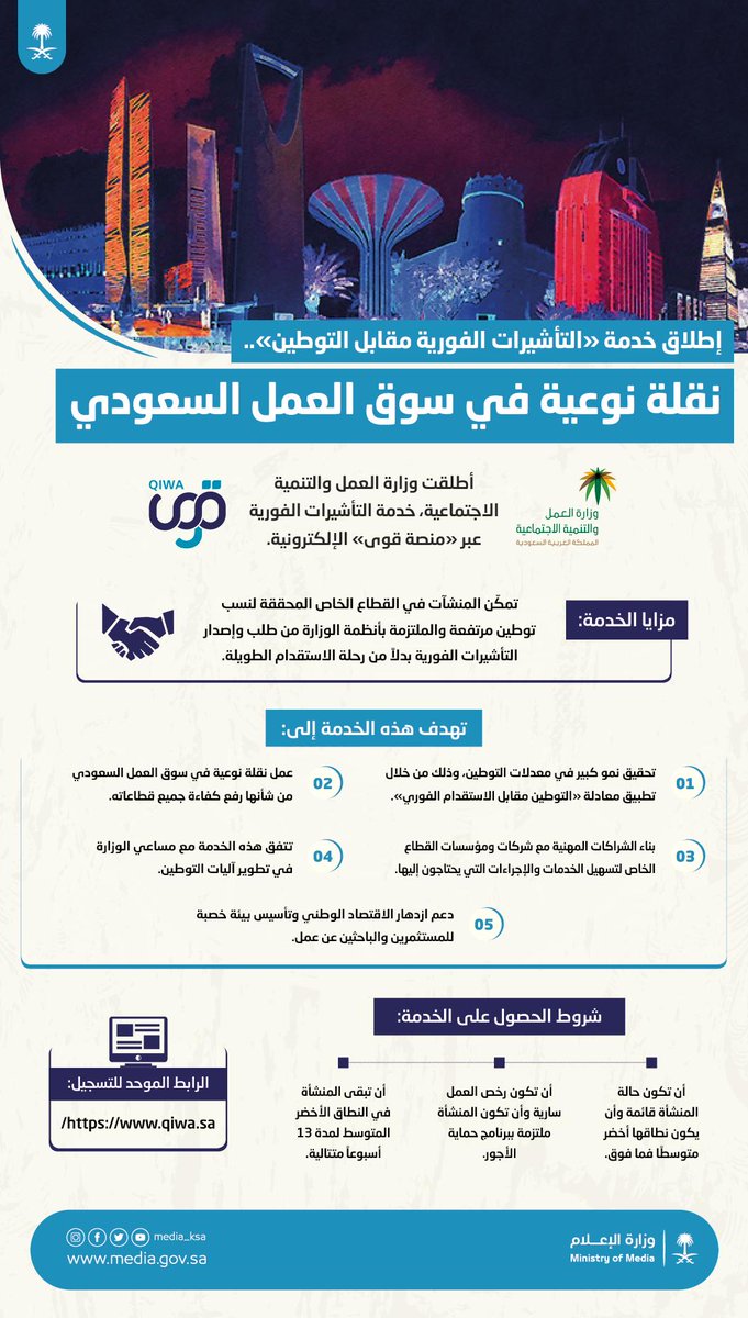 وزارة الإعلام Auf Twitter إنفوجرافيك عبر منصة قوى التأشيرات الفورية مقابل التوطين خدمة تقدمها وزارة العمل