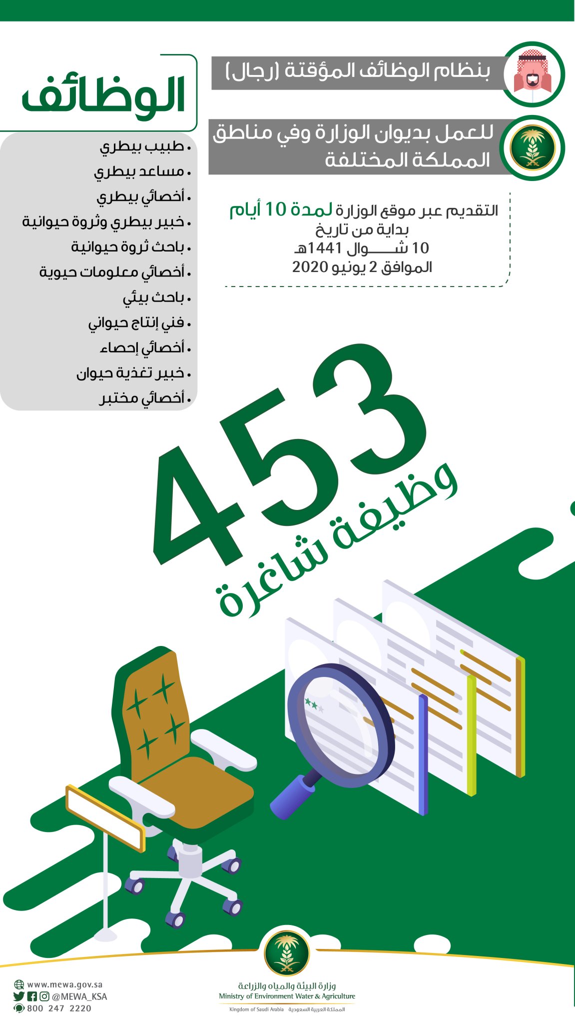 وزارة البيئة والمياه والزراعة On Twitter طرحت وزارة البيئة والمياه والزراعة 453 وظيفة رجال للعمل بديوان الوزارة وفي مختلف مناطق المملكة بنظام الوظائف المؤقتة لمعرفة الشروط المطلوبة وموعد التقديم والوظائف المتوفرة يمكن الدخول إلى موقع